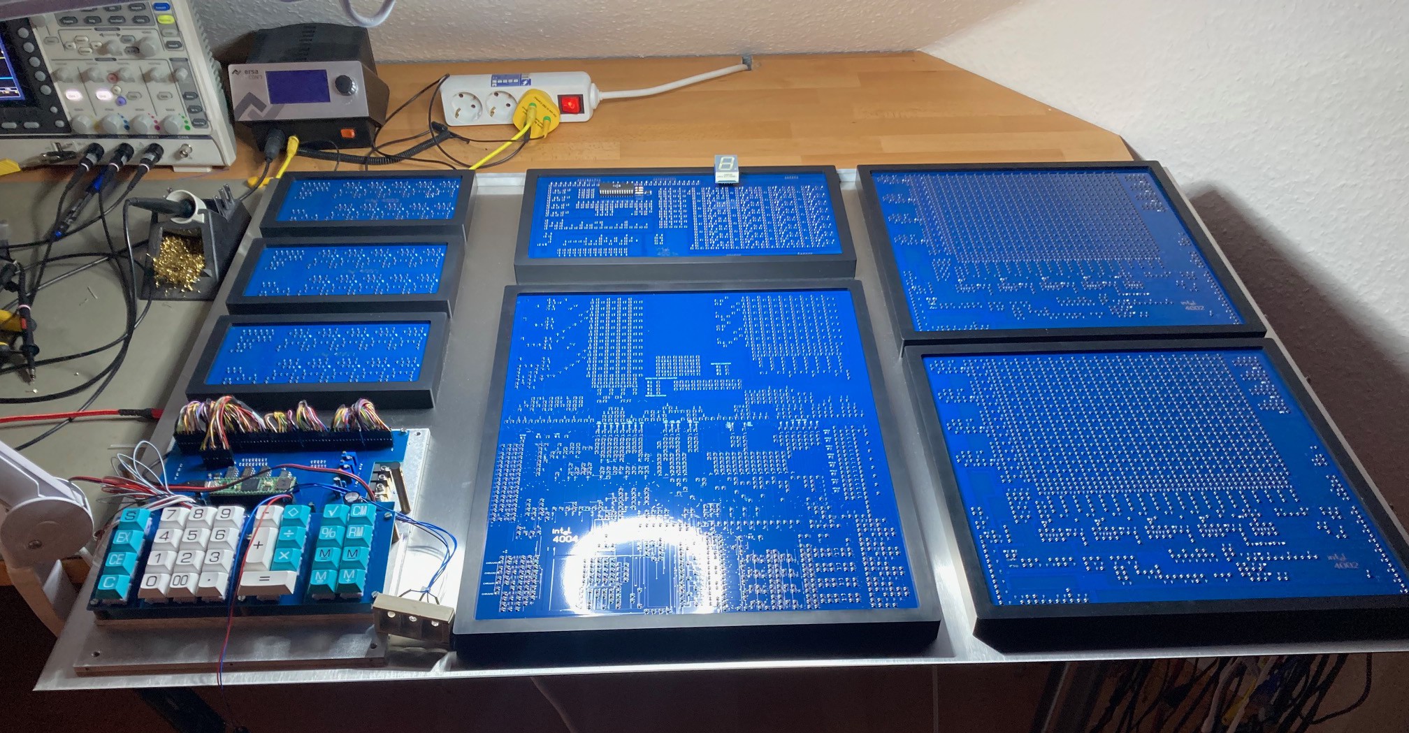 Der original Busicom 141 Tischrechner ist mit dem 4004 Chipsatz aufgebaut, nämlich dem CPU 4004, 2xRAM 4002, ROM 4001, und 3xSchieberegister 4003. Diese sieben ICs wurden aus einzelnen Transistoren nachgebaut (ca. 6000 Stück) und zusammengeschaltet. Es läuft die Originalsoftware des Busicom 141.